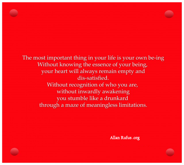 “The most important thing in your life is your own be-ing. Without knowing the essence of your being, your heart will always remain empty and dis-satisfied. Without recognition of who you are, without inwardly awakening you stumble like a drunkard through a maze of meaningless limitations.” Quote from The minds use-fullness depends on the thoughts of the user.